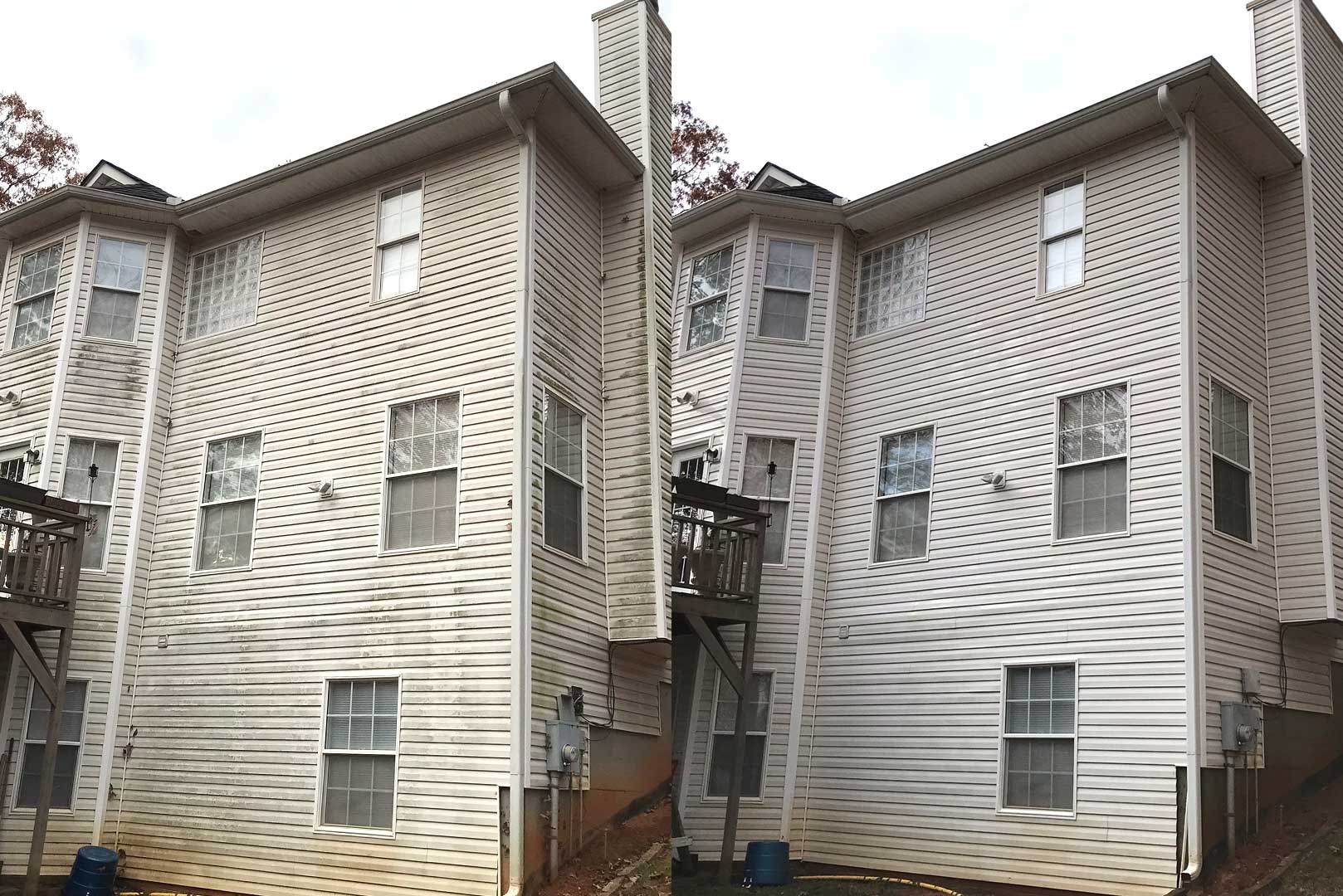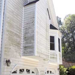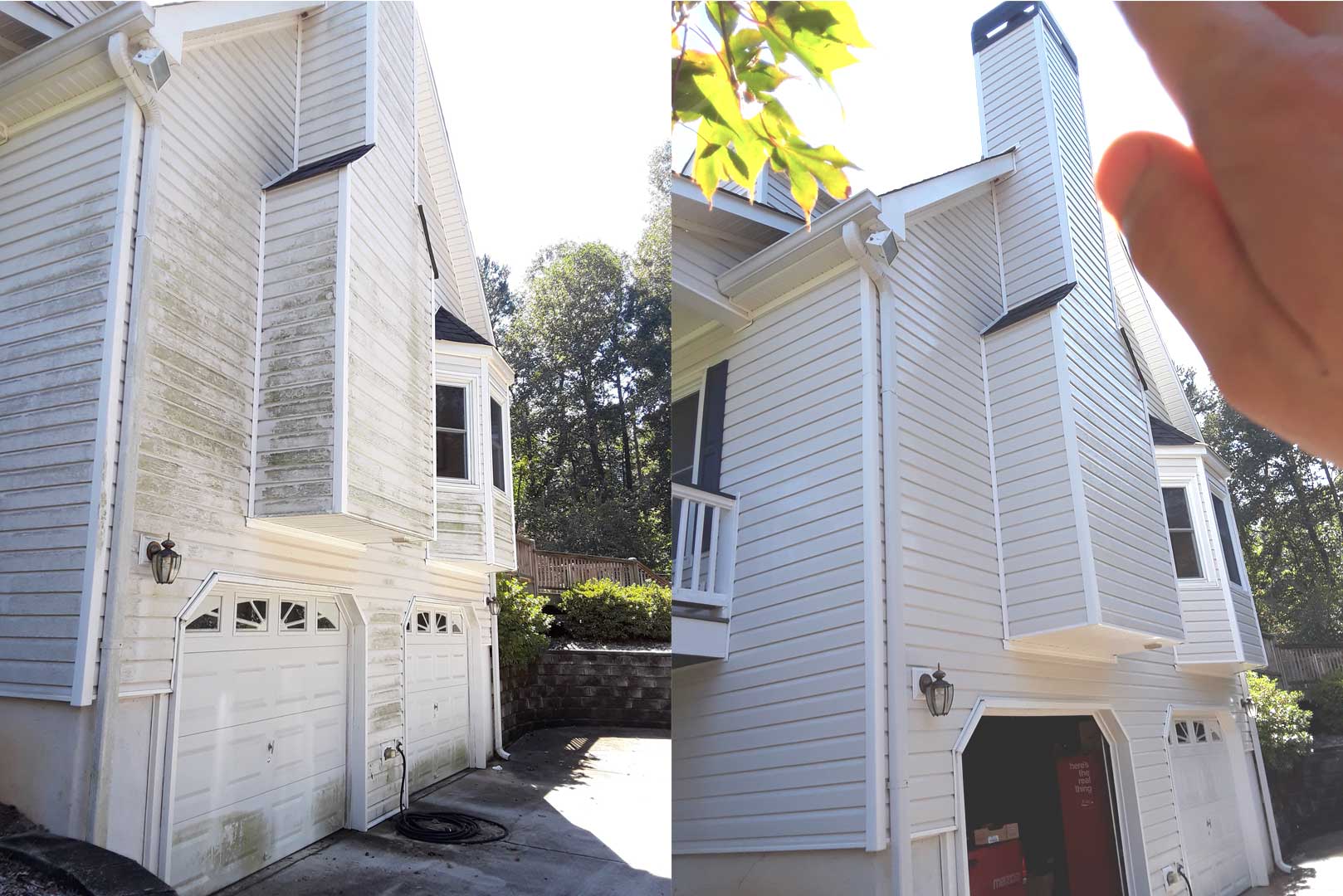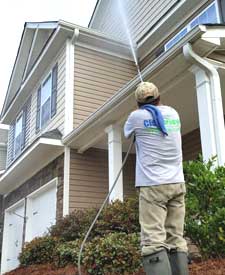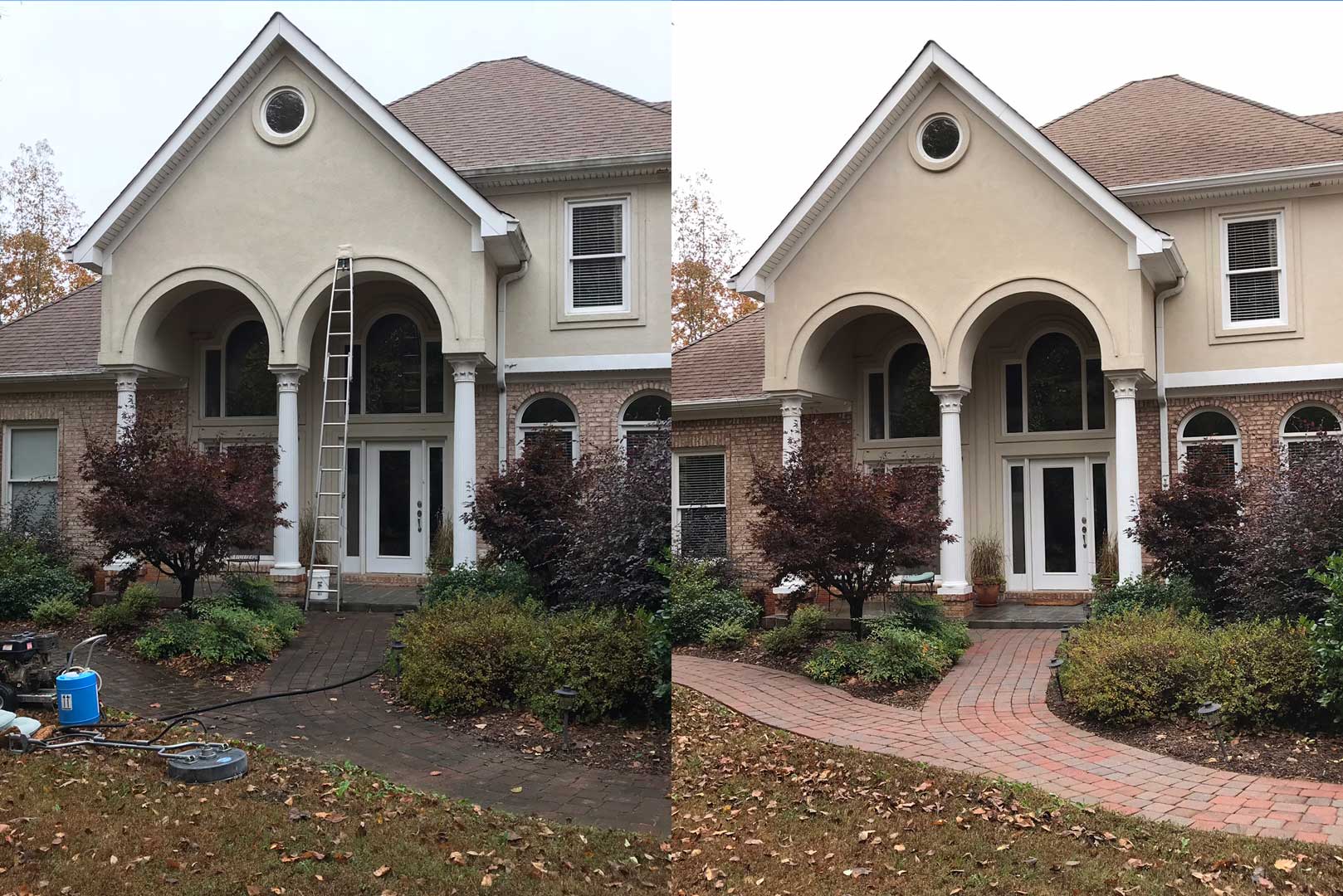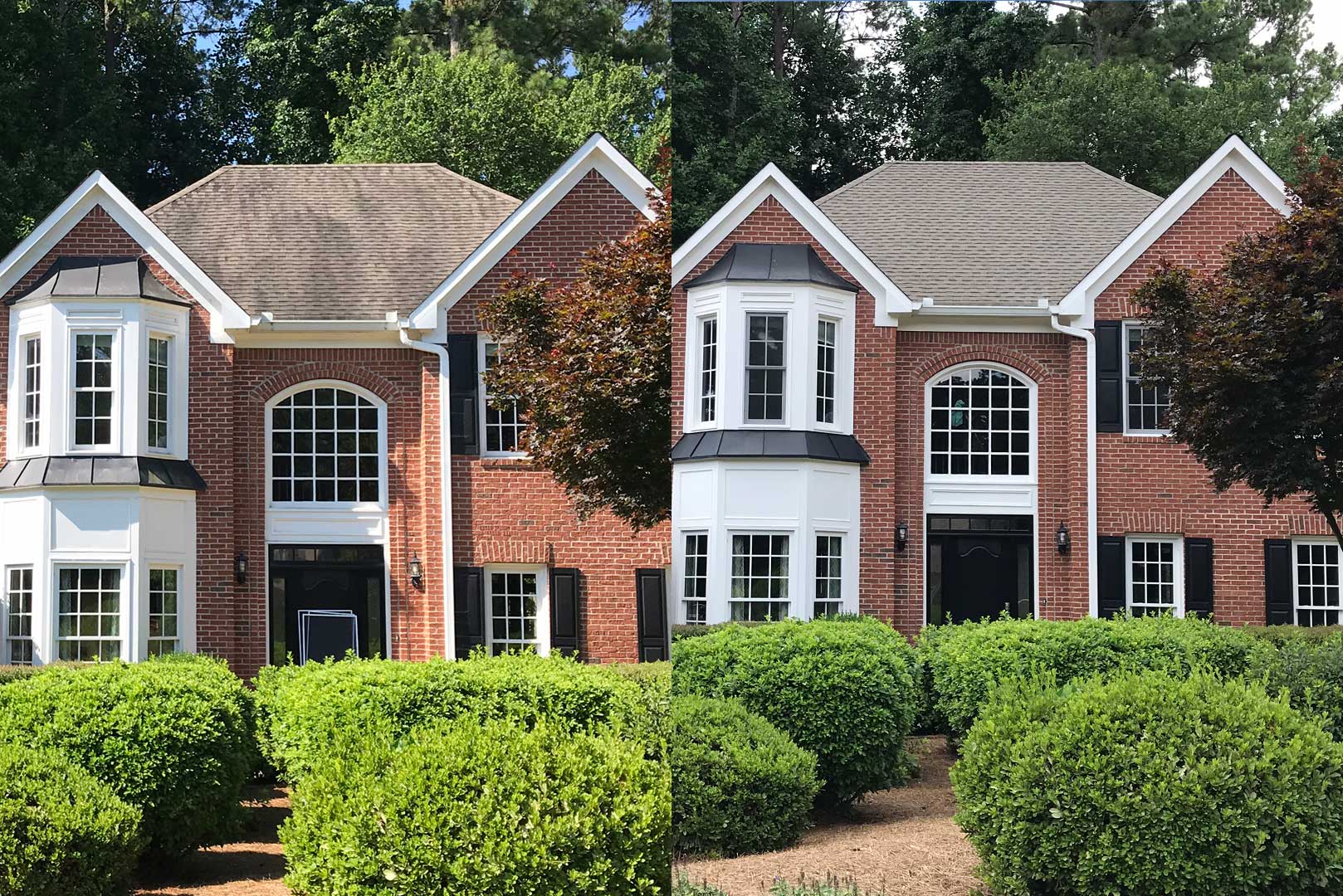Our low pressure house washing service includes cleaning your home from the ground to the gutters. This will include all siding, fascia, soffit, shutters, window frames, painted surfaces and the outside of the gutters. This low pressure detergent cleaning provides a great general cleanup. This type of cleaning is designed for removing mold, mildew, algae, spiders/webs, surface dirt and also sanitizes the surfaces. Our standard house wash service does not include items such as interior gutter cleaning, roof cleaning, decks, driveways or fencing. We do offer these services at a separate cost. This low pressure method of cleaning may not remove some stains such as red clay, rust, vertical black lines on the face of gutters and oxidation (chalky paint that is failing from the exterior elements).